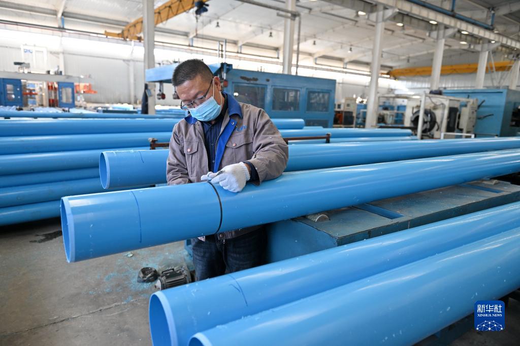 12月1日,位于望都县的河北万利泰欧勒管业有限公司工人在测量PVC管材尺寸。