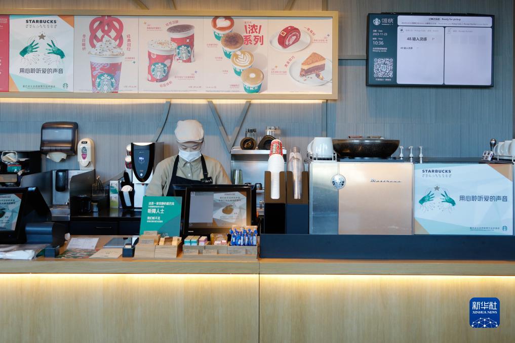 11月23日,咖啡师在位于北京市丰台区西铁营的星巴克咖啡手语门店工作。
