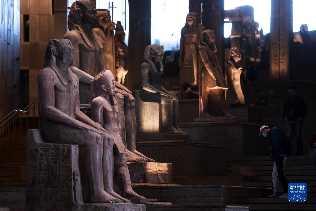 11月30日,一男子在埃及吉萨的大埃及博物馆参观“大楼梯”走廊上的雕像。