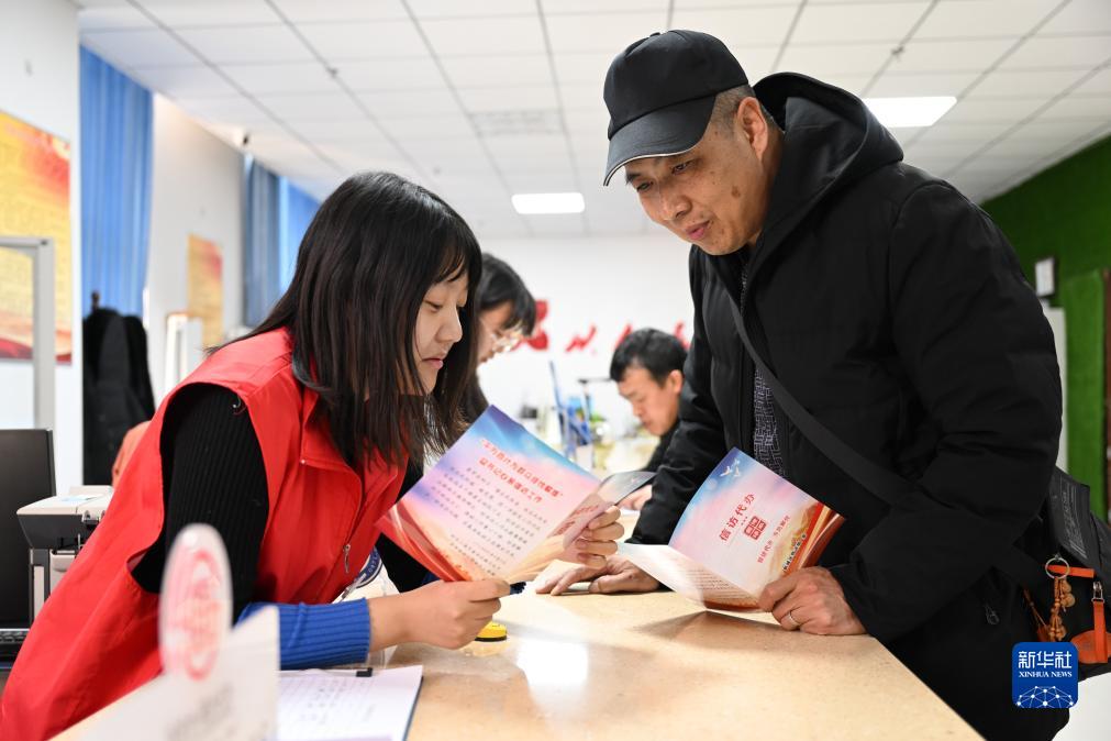 11月30日,在内蒙古呼和浩特市新城区苏雅拉社区,信访代办员、社区工作人员(左)向群众介绍信访代办政策。