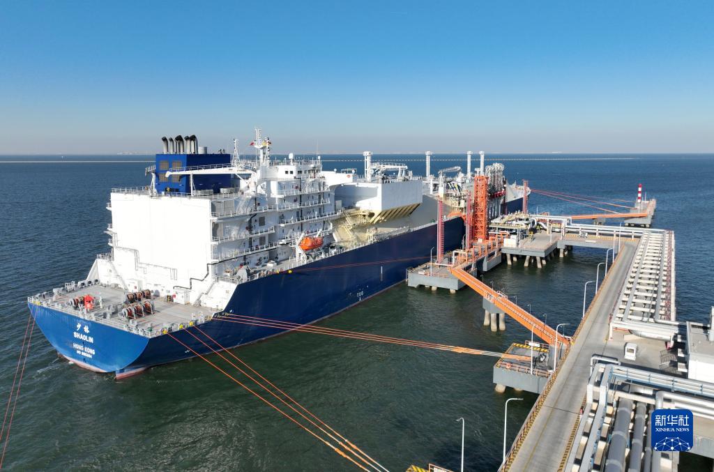 12月1日,“少林”号LNG运输船靠泊在中国石化天津LNG接收站2号泊位(无人机照片)。