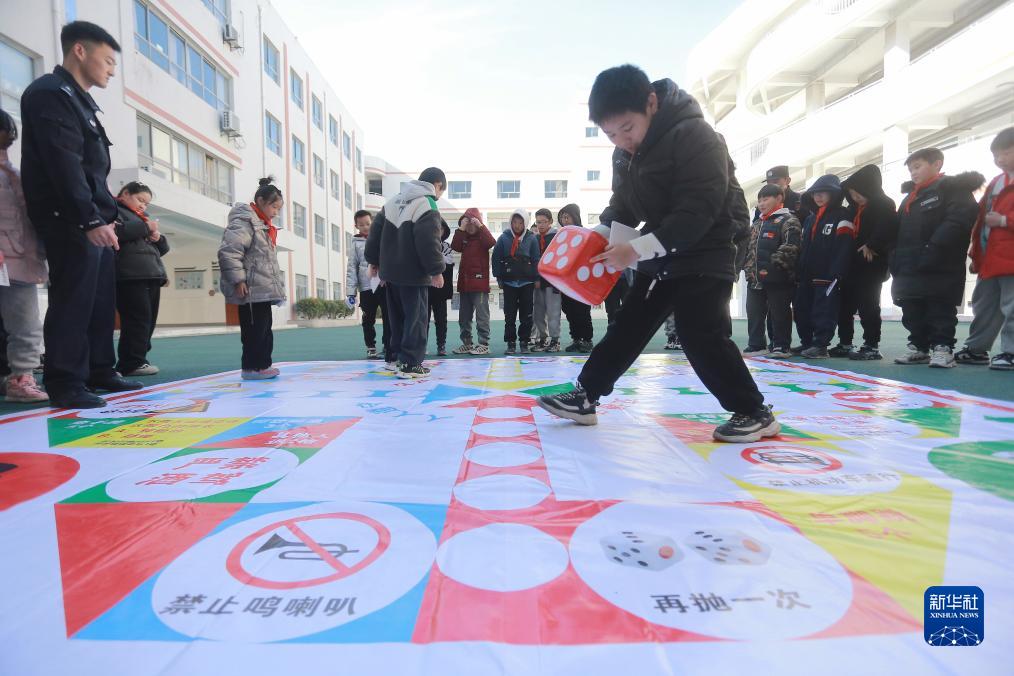 12月1日,江苏省扬州市生态科技新城公安铁骑队民警带领学生体验互动游戏——交通飞行棋。