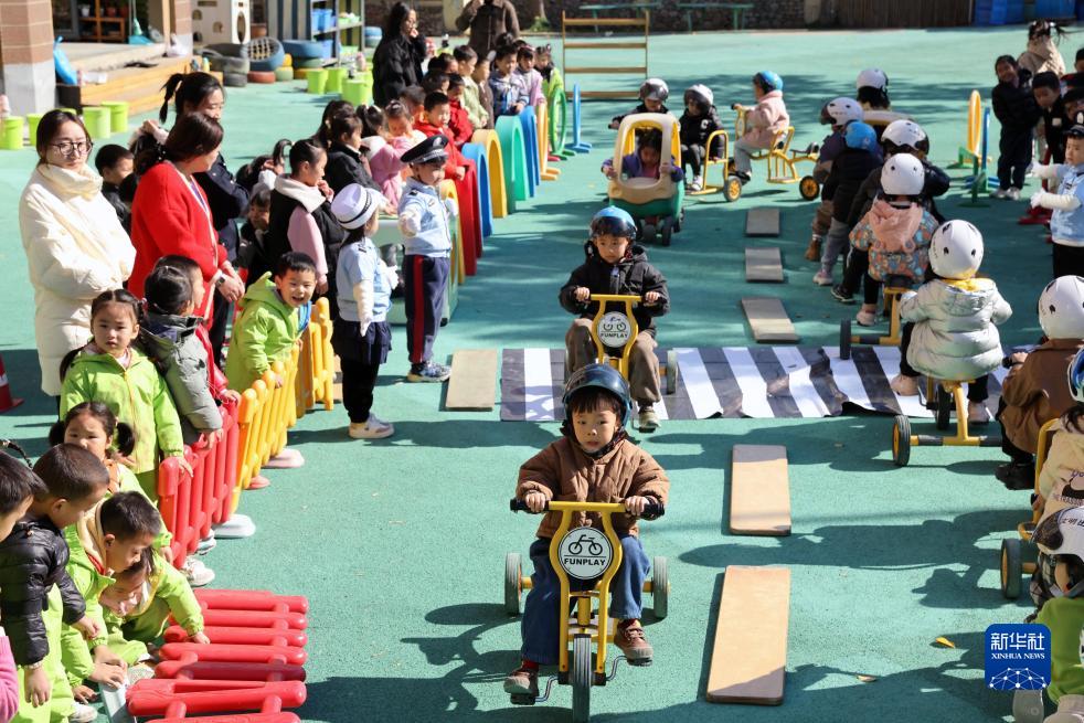 12月1日,在浙江省湖州市德清县乾元镇第一幼儿园,孩子们体验交通游戏。