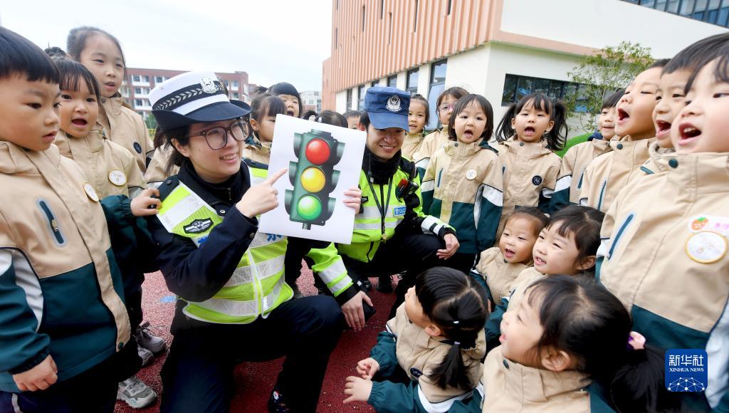 12月1日,在浙江省台州市路桥区南官实验幼儿园,交通警察给小朋友们讲解交通指示灯的变化和用途。