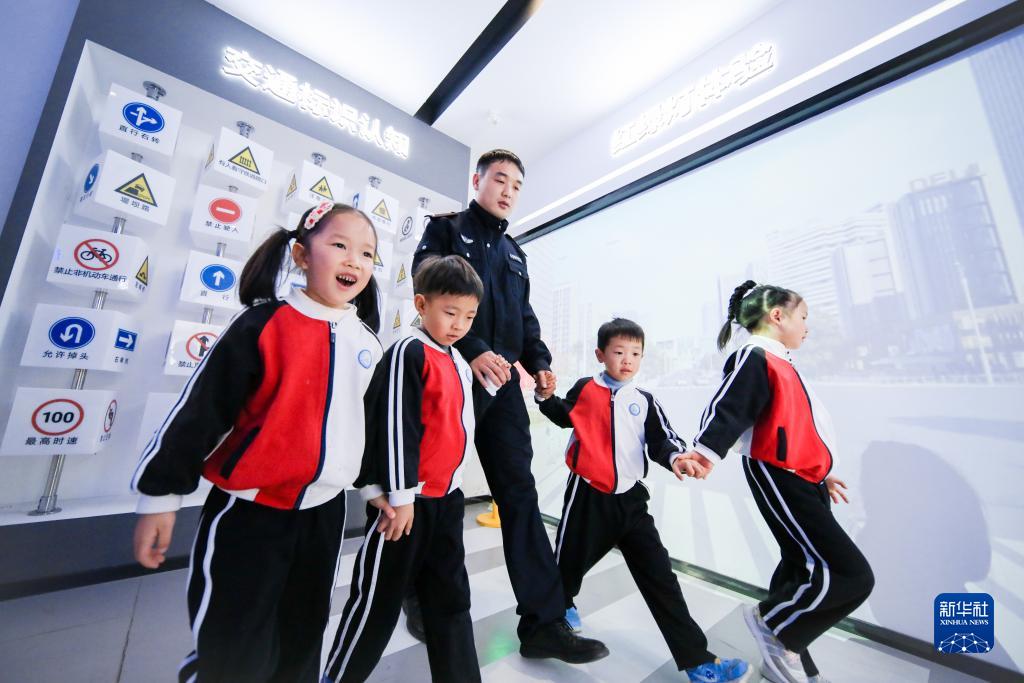 12月1日,在浙江省湖州市长兴公安“龙警官”现代警务室内,孩子们在虚拟投影下体验安全过人行横道。
