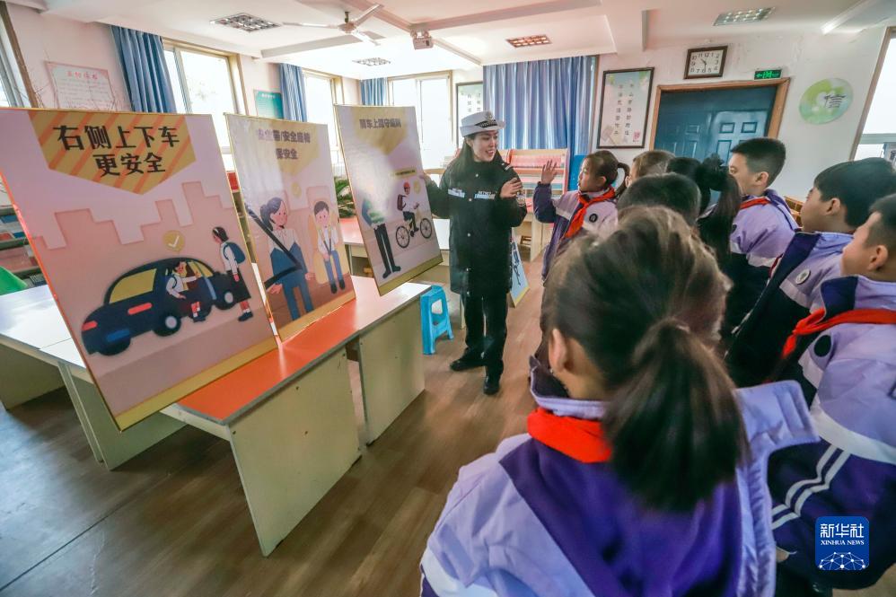 12月1日,民警在河北省遵化市第二实验小学为学生讲解交通安全知识。