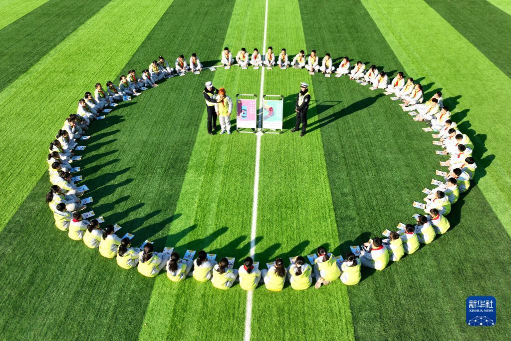12月1日,在山东省聊城市茌平区第二实验小学,交警为学生们讲解如何安全佩戴头盔(无人机照片)。