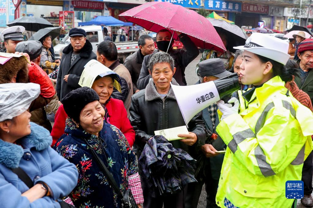 12月1日,宣讲小分队成员在四川省华蓥市高兴镇向赶场的群众宣讲交通安全知识。