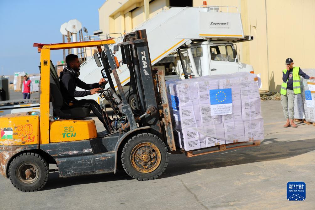 11月30日,在埃及北西奈省阿里什机场,工作人员转运援助物资。