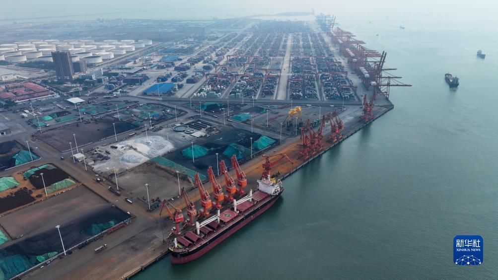 一艘货轮停靠在钦州港码头西港区装运货物(11月24日摄,无人机照片)。