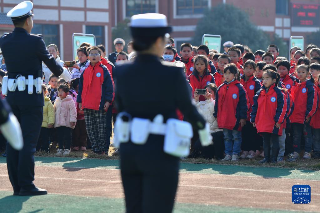 12月1日,在长沙市望城区新河学校,学生观看交警手势演示。