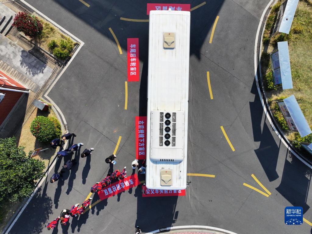 12月1日,在长沙市望城区新河学校,学生参加汽车盲区体验活动(无人机照片)。