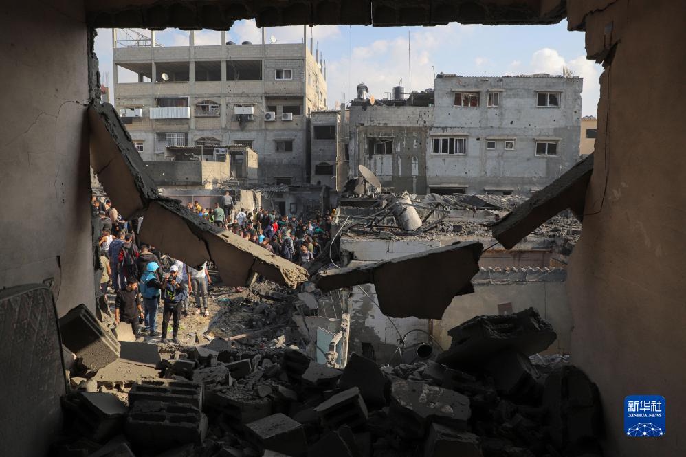 12月1日,在加沙地带南部城市汗尤尼斯,人们查看以军空袭后的废墟。