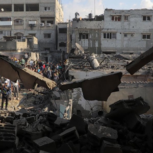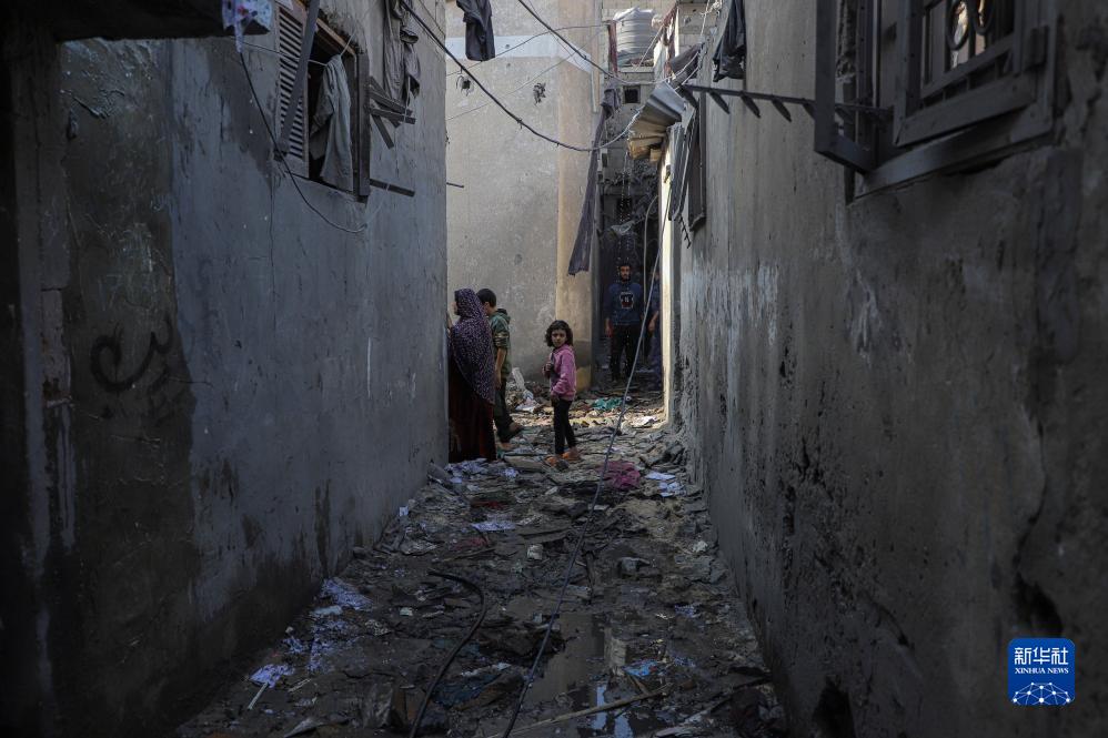 12月1日,在加沙地带南部城市汗尤尼斯,人们查看以军空袭后的废墟。