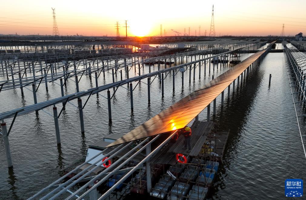 12月1日,工人在河北省唐山市丰南区黑沿子镇渔光互补项目建设工地施工(无人机照片)。