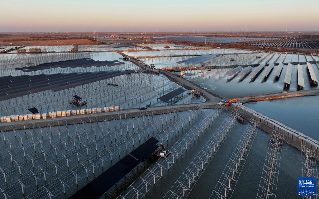 12月1日,工人在河北省唐山市丰南区黑沿子镇渔光互补项目建设工地施工(无人机照片)。