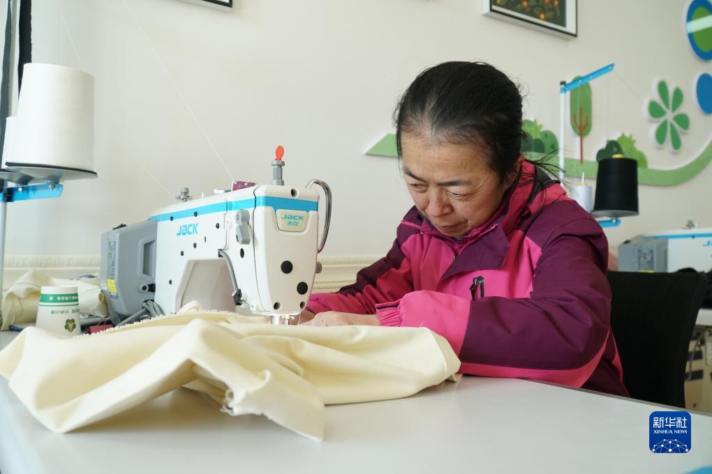 12月1日,在青海省西宁市星辰社会工作服务中心“智爱工作坊”辅助性就业基地,就业员工在缝制帆布袋。