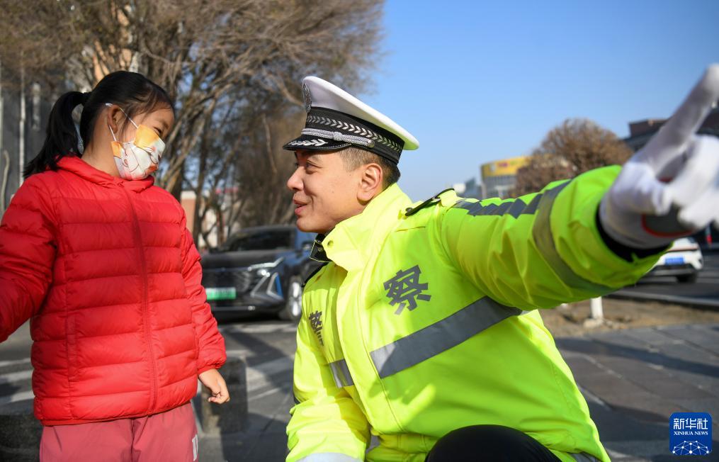 12月2日,在乌鲁木齐南湖路附近,乌鲁木齐市公安局交警支队民警向一名小朋友宣讲交通安全知识。