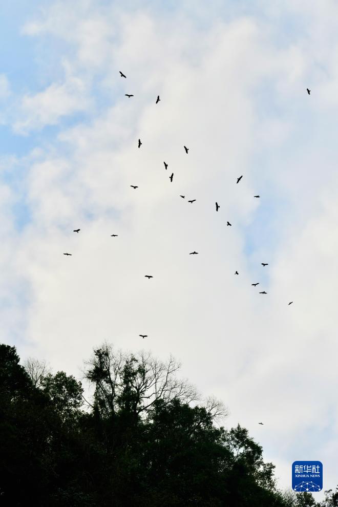 12月2日,一群黑鸢在福建省三明市泰宁县大金湖上空盘旋飞翔。