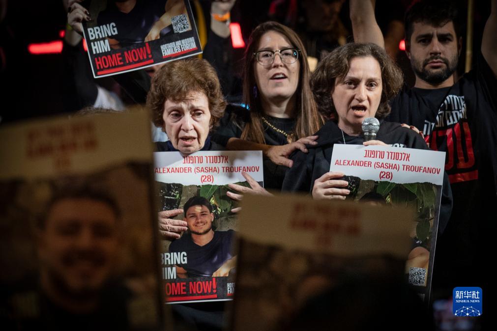 12月2日,此前获释的两名被扣押人员(前左、前右)在以色列特拉维夫参加集会,呼吁以色列政府采取措施让全部被扣押在加沙地带的人员尽快获释。