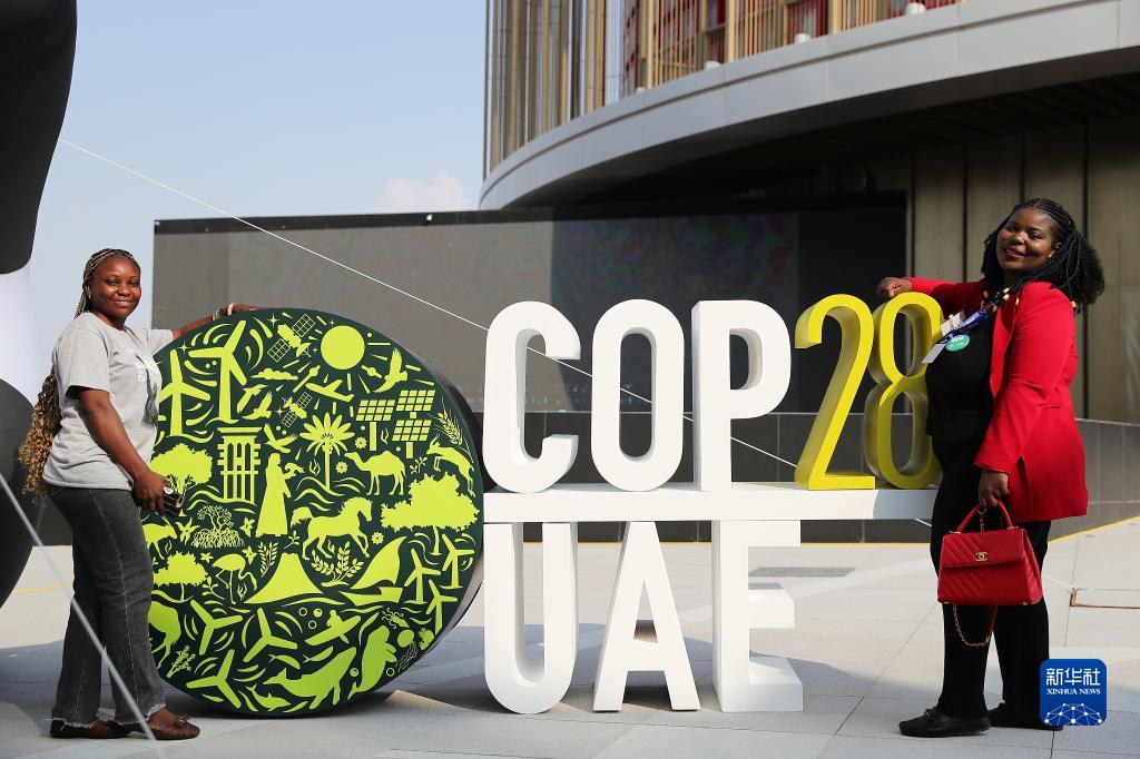 12月3日,人们在联合国气候变化迪拜大会“绿区”的大会标识旁合影。
