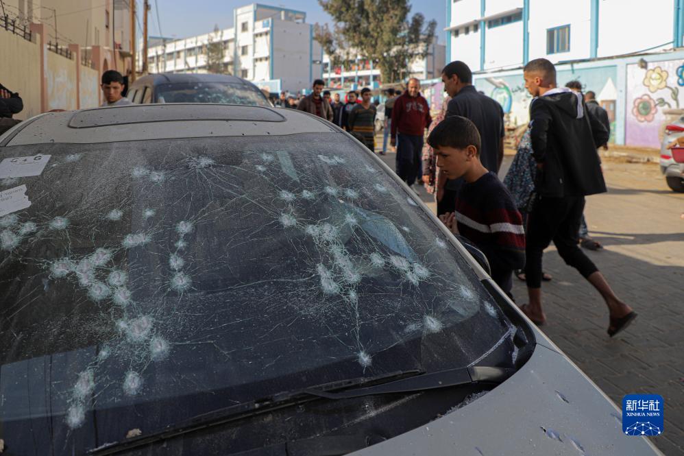 12月3日,在加沙地带南部城市汗尤尼斯的一所学校附近,人们查看以军袭击后的受损情况。