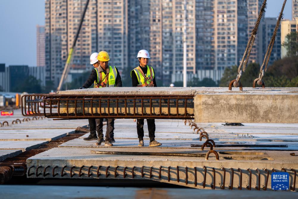 12月4日,工人在长沙万家丽路快速化改造北延线工程施工现场进行桥面板安装作业。