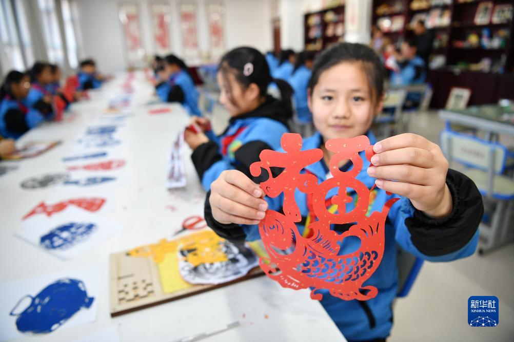 隆德县第二中学学生在展示剪纸作品(11月30日摄)。