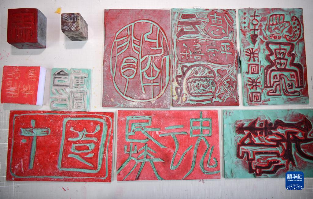 隆德县第二中学学生制作的篆刻作品(11月30日摄)。
