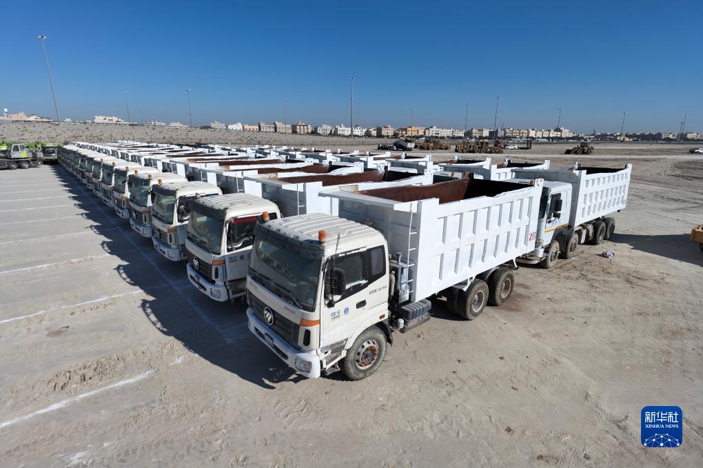 这是12月4日在科威特杰赫拉省南萨阿德阿卜杜拉新城基础设施项目施工现场拍摄的中国自卸卡车(无人机照片)。
