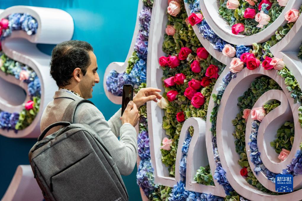 12月5日,在云南昆明参加第五届世界媒体峰会(云南分会场)暨第二届大象国际传播论坛的参会代表拍摄展出的鲜花墙。
