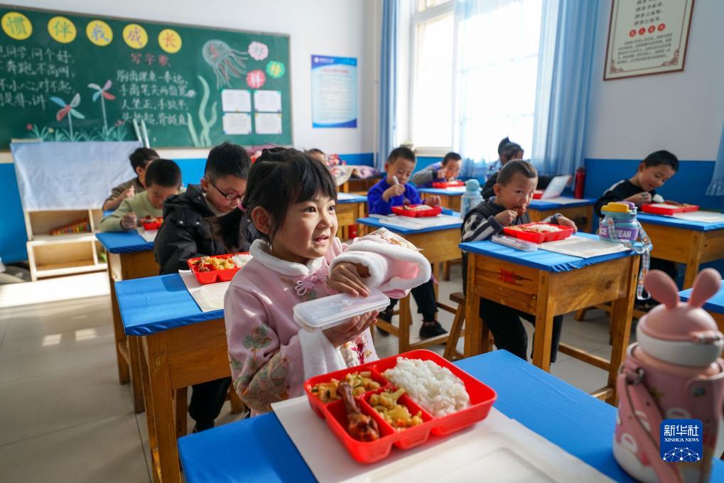 12月5日,在乐亭县胡家坨镇中心小学,学生在教室内吃午餐。