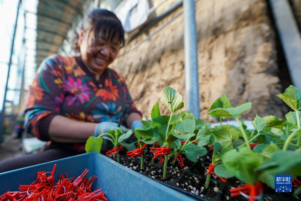 12月5日,河北省乐亭县一家育苗基地的工人在育苗棚内嫁接秧苗。