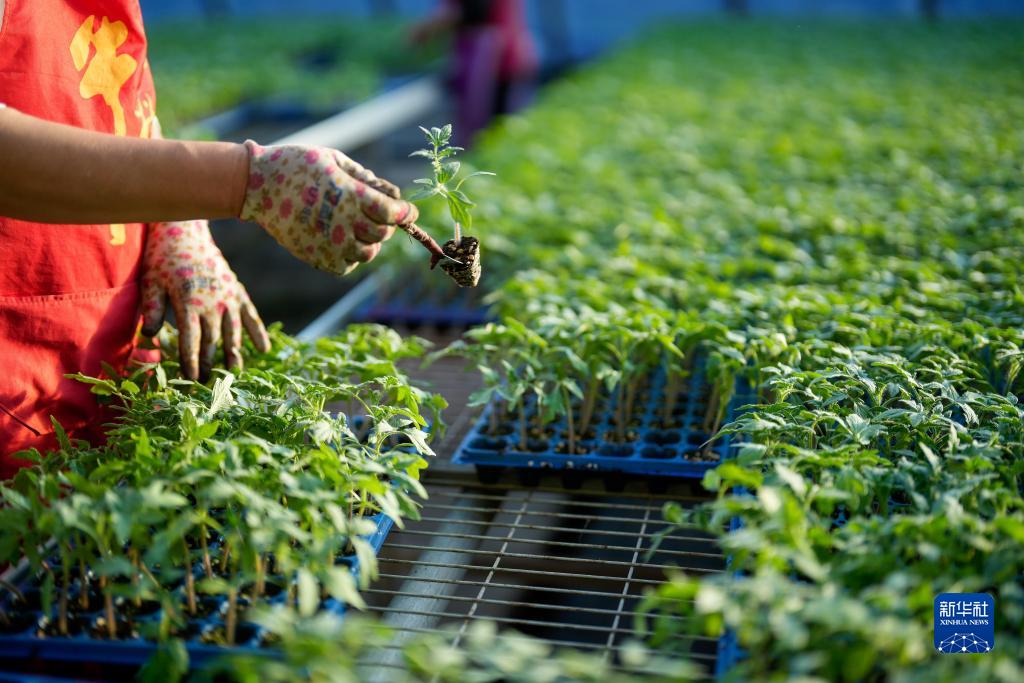12月5日,河北省乐亭县一家育苗基地的工人在育苗棚内打理秧苗。