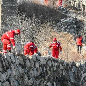 12月5日,志愿者在河北省遵化市兴旺寨镇花椒园村古长城捡拾垃圾杂物。