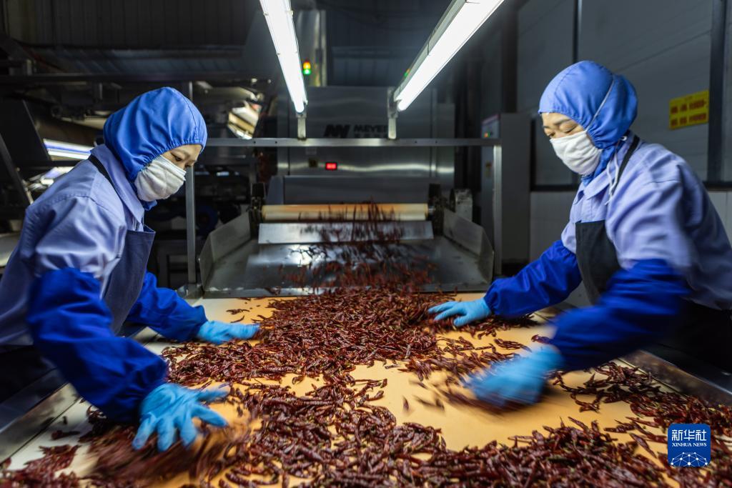 12月5日,在重庆市合川区的重庆梅香园实业集团有限公司,工人们在辣椒生产车间作业。