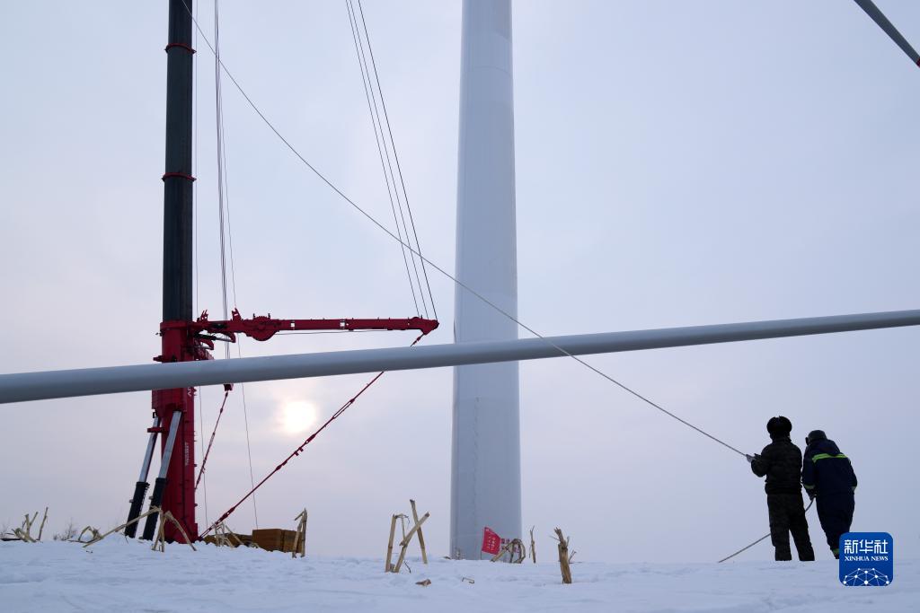 12月5日,工人在华电黑龙江区域哈尔滨依兰鸡冠山风电场四期项目风电机组吊装现场作业。