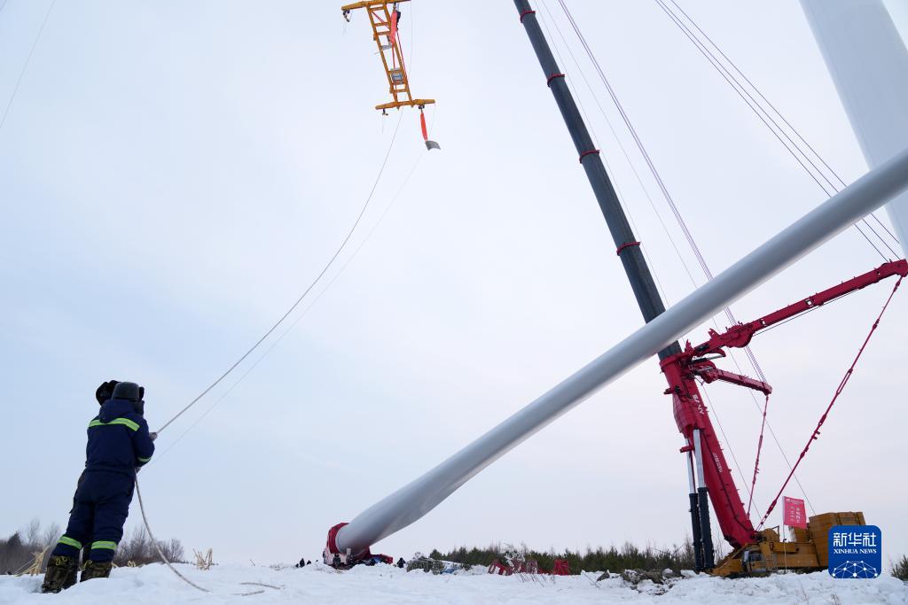 12月5日,工人在华电黑龙江区域哈尔滨依兰鸡冠山风电场四期项目风电机组吊装现场作业。