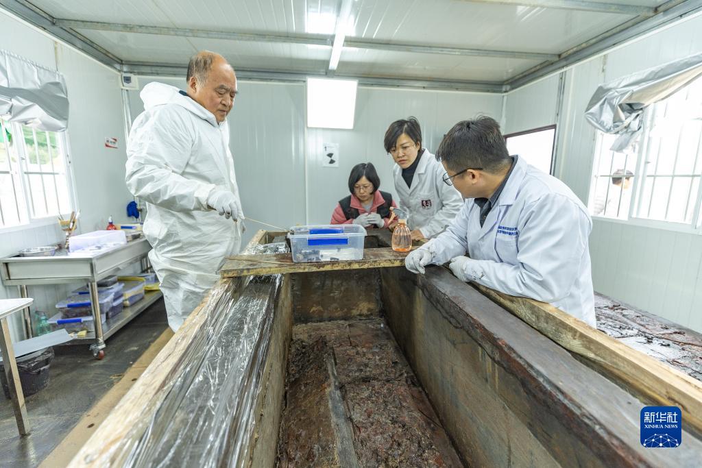 12月5日,在重庆市武隆区,考古工作人员在“关口西汉一号墓”现场保护实验室内工作。