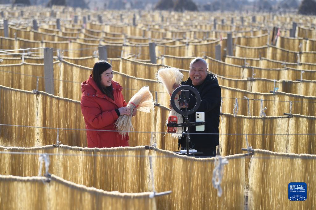 12月6日,河北省迁安市夏官营镇梁庞庄村村民在当地一处粉条晾晒场直播推介粉条。