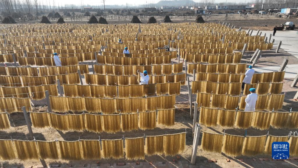 12月6日,河北省迁安市夏官营镇梁庞庄村一家粉条加工企业的工人在晾晒粉条(无人机照片)。