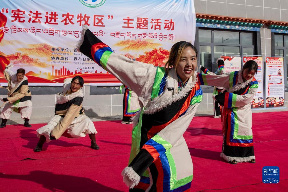 12月6日,森布日生态搬迁安置点的群众在“宪法进农牧区”主题活动上表演歌舞。
