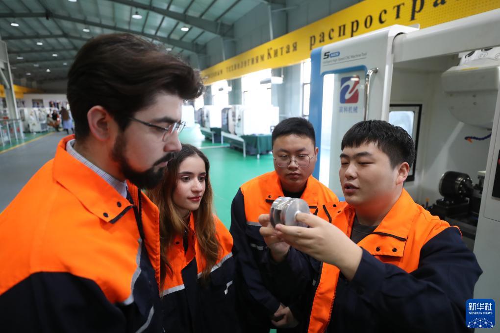 12月6日,沈工-华中数控“一带一路”订单班同学为俄罗斯伊尔库茨克国立大学的留学生讲解数控五轴加工中心操作经验。