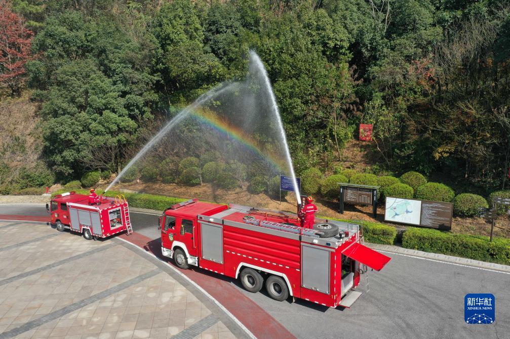 12月7日,在长沙岳麓山风景名胜区桃花岭景区,森林消防员在演练中向模拟起火点喷水(无人机照片)。