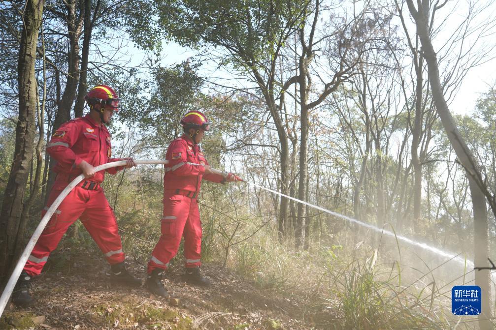 12月7日,在长沙岳麓山风景名胜区桃花岭景区,森林消防员在进行灭火演练。
