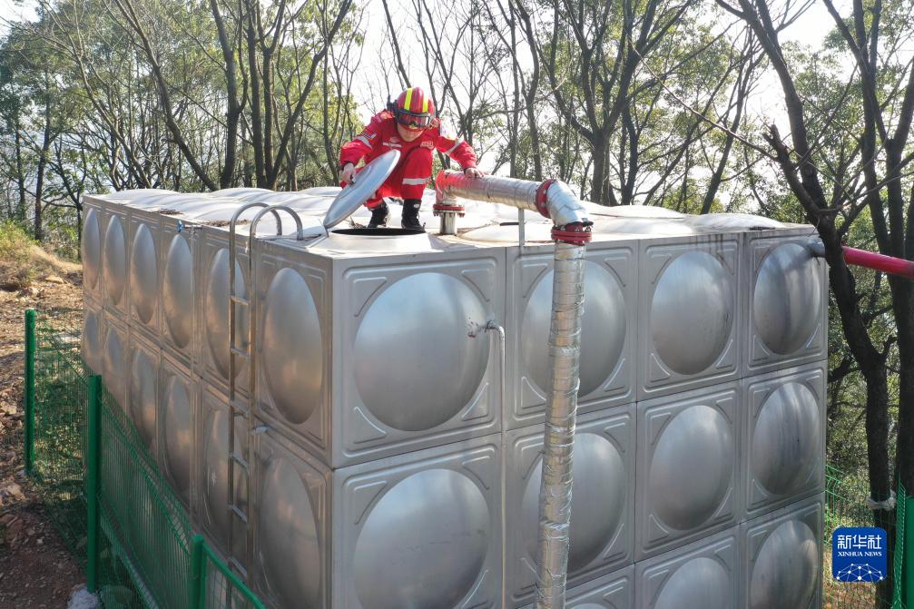 12月7日,在长沙岳麓山风景名胜区桃花岭景区,森林消防员在演练中检查森林消防储水池情况(无人机照片)。