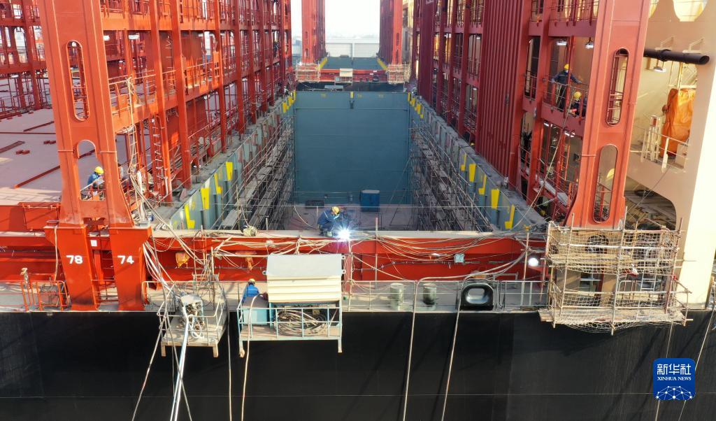 12月5日,在位于江苏省泰兴市的江苏扬子鑫福造船有限公司,工人在一艘集装箱船上作业(无人机照片)。