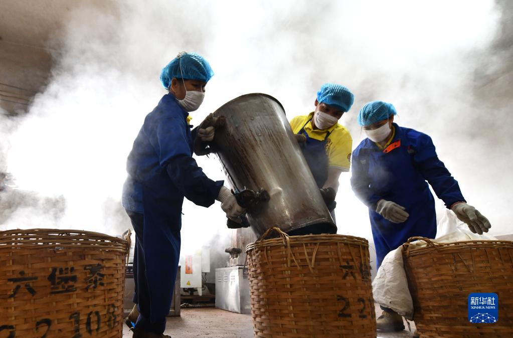 在梧州市中茗茶业有限公司,工人在蒸茶、压筐(11月29日摄)。