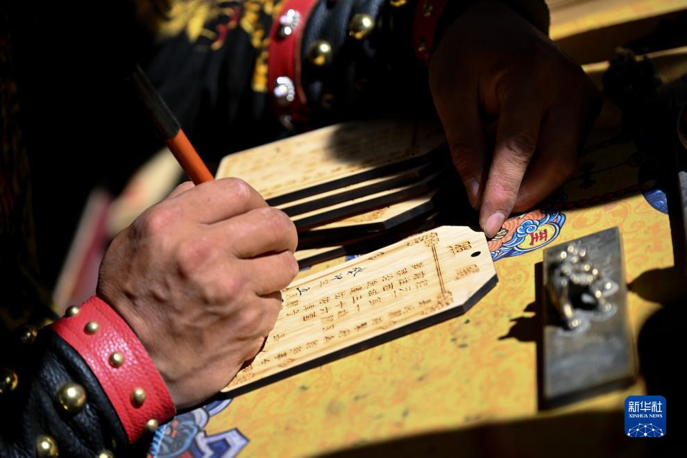 7月13日,在甘肃嘉峪关关城景区,李森为游客手写文创产品“关照”。