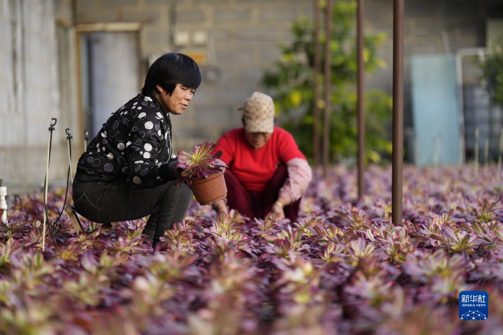 12月7日,农民在河北省唐山市丰南区胥各庄镇一处大棚内打理多肉植物。